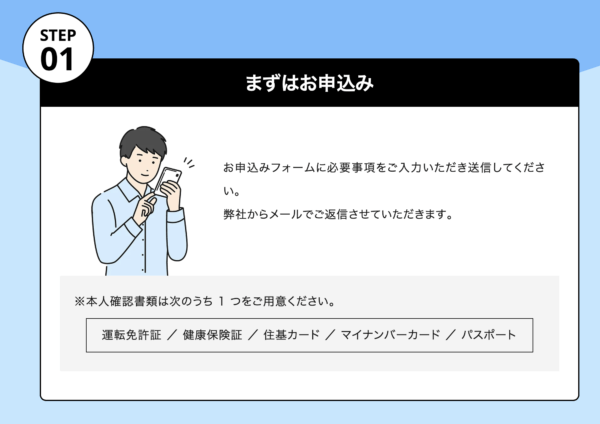 本人確認書類の提出で、「運転免許証」「健康保険書」「住基カード」「マイナンバーカード」「パスポート」のどれか1つを準備。
