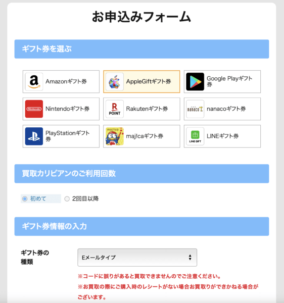 Apple、Amazon、Google、nanaco、 LINE gift、Nintendo、maj!ca、PlayStation、Rakuten、その他 |