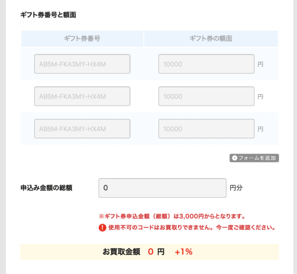 ギフト券番号、申込金額の総額を記入。