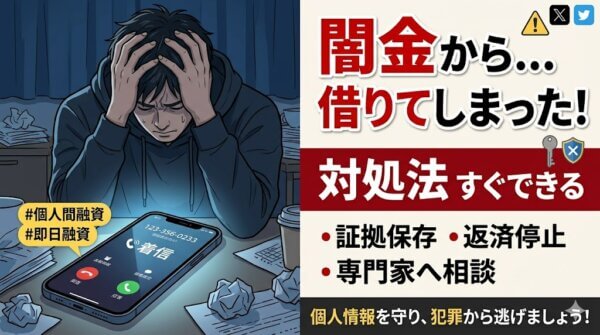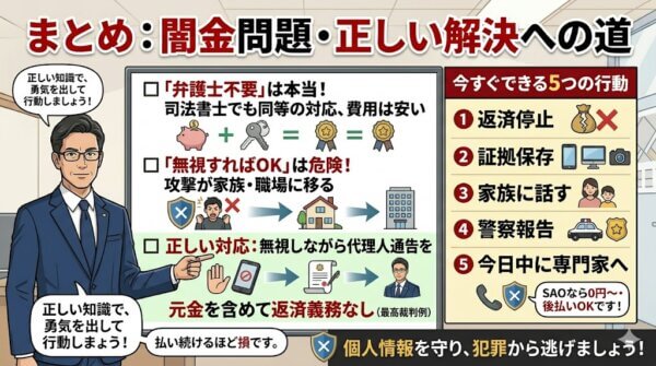 - 今すぐできる5つの行動:①返済停止②証拠保存③家族に話す④警察報告⑤今日中に専門家へ