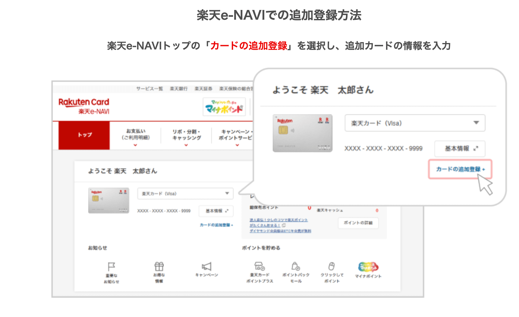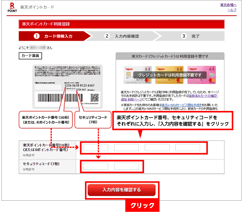 届いたら、会員サイト楽天e-NAVIに家族カード会員の楽天ID、パスワードで利用開始手続きをしましょう。